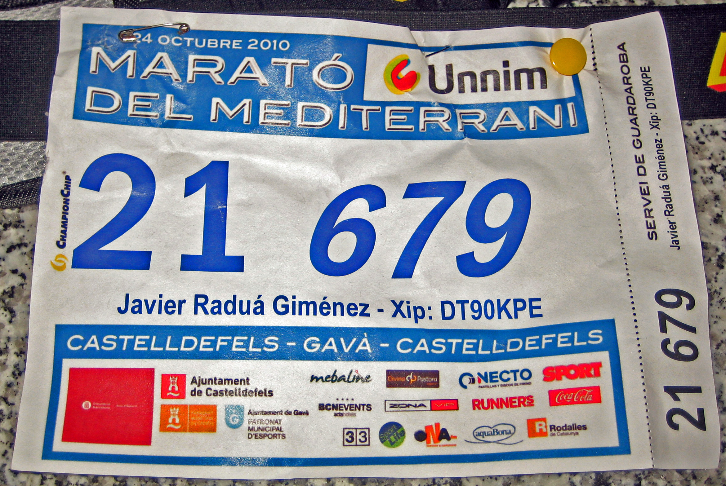 Ayer sábado fuí a recoger el dorsal y la bolsa con los obsequios a primera hora de la mañana. Desde el primer momento me dí cuenta de que era una carrera bien organizada. Al llegar al Hotel BCN Events , lugar de recogida de dorsales, encontré en un pasillo toda una pared empapelada con los 4000 y pico inscritos en las diversas carreras (10 km, 21 km y 42 km) y con sus respectivos dorsales asignados para poderlos recoger en el salón contiguo. Ya en el salón había unas diez personas aproximadamente repartiendo los dorsales, las bolsas de obsequios y uno de los voluntarios dedicado a las incidendias, al que tuve que pedirle que modificara mi fecha de nacimiento ya que constaba que tenía cinco meses de vida.