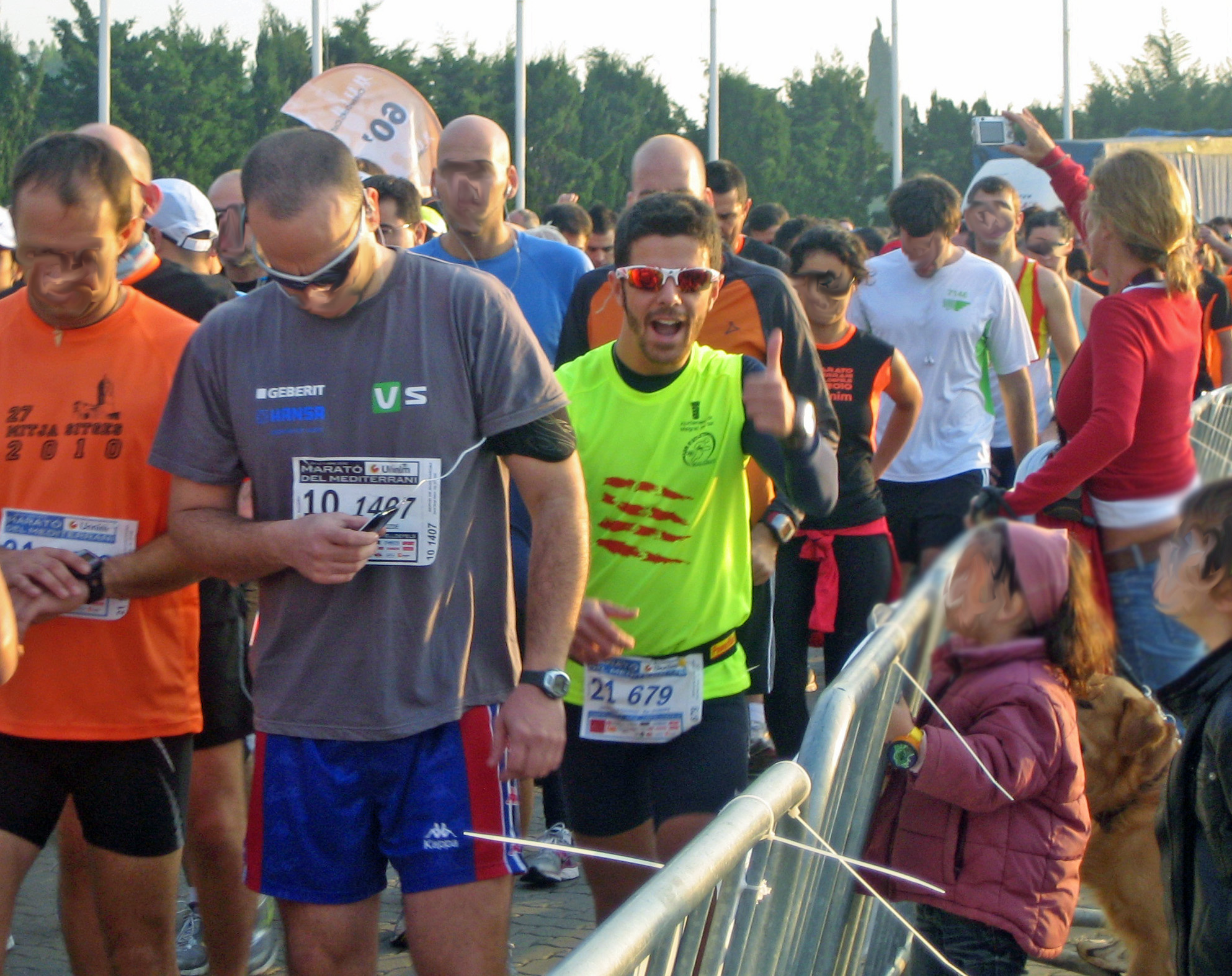 Cómo decía era una carrera bien organizada pero no quiere decir que esté exenta de errores para mi gusto. Creo que en las carreras en las que hubiera un gran número de participantes deberían evitar salidas en las que se formaran embudos. Pienso que podría solucionarse haciendo una salida simultánea pero con varias puertas, para que la gente saliera más repartida y sin provocar tapones. La salida era desde un pasillo hecho con vallas lo que no evitó que los tramposos y los impacientes se las saltaran a la torera. Al empezar a correr descubrí otro punto a favor de la organización, delante de todo iva un coche con el cronómetro y varios ciclistas indicando con números las posiciones de los tres primeros corredores de cada carrera. Y no sólo eso si no que había un servicio de «liebres» a cargo de la organización www.corredors.cat que te marcaban el ritmo de carrera que hacían para que el que quisiera los pudiera seguir.