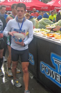 ¡Casi la mitad! Continúo con el frío calando en mi cuerpo por Arco de Triunfo. Por dónde hace unos  minutos era la zona de salida ahora ya no hay casi nadie. Veo menos público debido a la lluvia y tampoco veo a mi novia ni a mi padre en la curva. Se deben estar resguardando de la lluvia, imagino. Saco el gel de glucosa que tengo guardado en el bolsillo, y ¡para dentro! Sin tiempo para pensar, sigo corriendo al mismo ritmo, ni muy rápido ni muy lento, pero sin tener ninguna referencia. A medida que pasan los minutos y recorro metros pienso en preguntar a alguno de los corredores que lleve GPS sobre que ritmo está llevando, pero en el fondo me falta el aliento y estoy muy concentrado en mantenerme a ese ritmo, ¡paso de preguntar!. Ya en la Diagonal mis intestinos empiezan a moverse más de lo estrictamente necesario. No sé si ha sido el gel o ha sido el Powerade, pero me da igual, mi objetivo está a poco más de 5km. Al pasar el Fórum, y corriendo después por el Port Olímpic, siento la brisa del mar, siento el frío producido por la gran humedad de esa zona. De repente a unos metros delante mío veo a un corredor que se aparta del grupo y colocándose una mano en el muslo se lamenta. ¡Vamos! le animo. Su cara lo dice todo, pero echo la mirada atrás y le veo avanzar y eso me anima a mí. Corre que te corre y llego a la Torre Mapfre y al Hotel Arts, ya queda menos. Empapado de todo, y de la cabeza hasta los pies miro mi pulsómetro y pienso que Coke, Jaume, Xavi.A ya deben haber llegado y me anímo a mi mismo para aumentar mi ritmo. Hago un cálculo aproximado de lo que me queda al llegar al Zoo de Barcelona. Veo lo que puedo tardar en recorrer los kilómetros que me separan de la meta y aún aprieto más. ¡No estoy seguro de bajar de 1:42:42h!, que es el tiempo que hice en la Marató del Mediterrani. Aprieto los dientes mientras me doy cuenta de que ya no llueve, pero el suelo está encharcado y resbaladizo. La gente aníma y aplaude, veo el final de Passeig de Picasso y la curva (ahora hacia la derecha), no veo ni a mi padre ni a Clara ¿dónde estan?. Sin tiempo para preguntas aumento más el ritmo, veo las metas flotantes, giro hacia la izquierza y subo por Passeig Lluís Companys y al fondo, aún al fondo diviso la meta. La corpulencia del corredor de delante y la distancia que me separa no me dejan ver el cronómetro final, corro más deprisa y lo avanzo. Lo veo, sí, lo veo marca 1:39:30h, ¡Corre Javi, que estás por debajo de 1:40h! ¡Vamos!, hago el último y titánico esfuerzo y cruzo la meta.