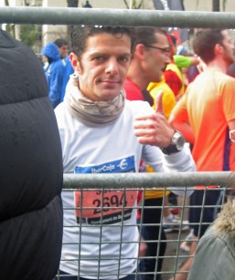 Ya preparados y semicalentados nos dirigimos hacia la salida con todo lo necesario, dorsal, chip, y mucha motivación. Nos encontramos con un follón tremendo. Toda la línea de salida está vallada y se accede a las marcas señaladas por la organización por unas puertecitas por las que ni yo consigo pasar si no es agachando la cabeza ¡pero esto que es!. Xavi me busca y yo le busco a él (menos mal que es muy alto). Hay muchísima gente intentando acceder y muy mala organización. Finalmente nos metemos como podemos y nos situamos entre los demás participantes, entre el calor humano, entre el palpitar de los corazones, entre miles de personas llenas de ganas por correr, y eso que el día no acompaña, está nublado y parece que va a llover. Xavi se mira las pulsaciones y me mira como queriendo decir ¡que nervios! y yo le miro con cara de ¡sí, yo también estoy hecho un flan!.