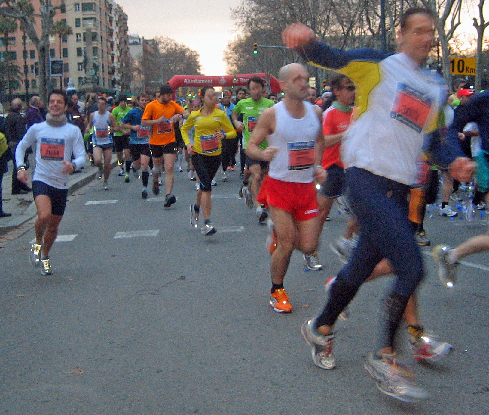 Xavi, que está haciendo de liebre empieza a tirar y tirar, y yo le sigo. ¡Estamos yendo muy fuertes! me dice al llegar a Las Ramblas. Le miro y pienso: si seguimos a este ritmo reviento… Entonces mientras mi cerebro intenta oxigenarse a ese ritmo Xavi empieza a dejar metros de por medio, y yo le intento «cazar» de nuevo, pero al llegar a los 5km aproximadamente veo que me es imposible seguirle a ese ritmo y le pierdo entre la multitud, y eso que a varios metros de distancia se le puede ver.