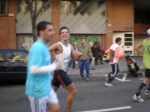 Bajando la Rambla Prim veo un corredor en el suelo con la cabeza ensangrentada y pidiendo explicaciones a un Guardia Urbano. Creo que se debió tropezar con alguien que cruzó la calle cuando no debía, casi seguro. Diagonal y ya llevamos veinticinco kilómetros, a partir de aquí todo es nuevo para mí, nunca había corrido tanto. En el veintisiete decido tomarme uno de los geles Power Bar, a la vez que me cargo las pilas con el agua y la isotónica que dan en el avituallamiento, estoy aprovechando muy bien los avituallamientos para no perder más sales minerales de la cuenta e hidratarme correctamente. Estamos a punto de llegar al treinta y le digo a Xavi que yo ya no aguanto más: -¡Tengo que parar a orinar!, y así lo hacemos mutuamente. ¡Qué descanso!. Pasado el kilómetro treinta, en la esquina Rambla Prim Diagonal veo a Clara, que se ha venido hasta aquí para verme, y eso que ha dormido sólo dos horas. La veo, me ve, me hace la foto y le digo: ¡Te quiero! Ahora estoy más motivado aún.