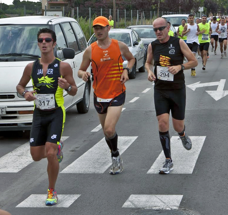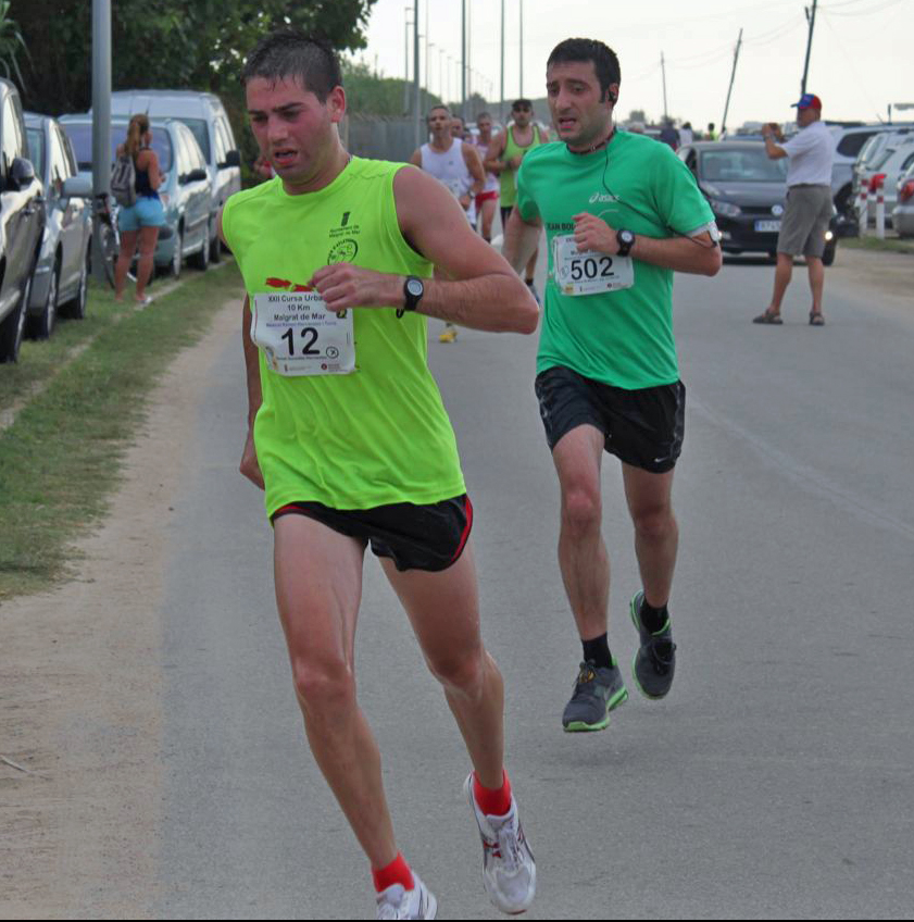 Llegué antes de hora, con tiempo, como siempre, y me acerqué a la entrada del polideportivo de Malgrat donde había quedado con él. Al ver que aún quedaban unos cnco minutos aproveché para calentar mis piernas un poquito. Y al poco de empezar a calentar oí una voz que dijo: -¡Qué tal Javier! y pensé: Tiene que ser Bernat, nadie me conoce por aquí, imagino que será el. Así que mientras me acercaba a él ví que sí, era Bernat. Nos saludamos y empezamos a calentar acompañados también por un amigo suyo. Ya quedaba poco para la salida y me acerqué a las primeras posiciones. Hablé con Bernat de cómo salir, y me dijo: -Nada, primero nos ponemos a tres y pico, y después a mantener a cuatro más o menos, y le dije: Joder, ¡¡qué fuerte vas!! Sonó el disparo que daba la salida…y ya…Bernat arrancó a una velocidad impresionante, yo intenté seguirlo desde la distancia, pero entre el ritmo que imponía y la muchedumbre no pude seguirle más de un kilómetro.