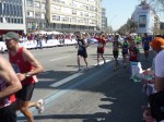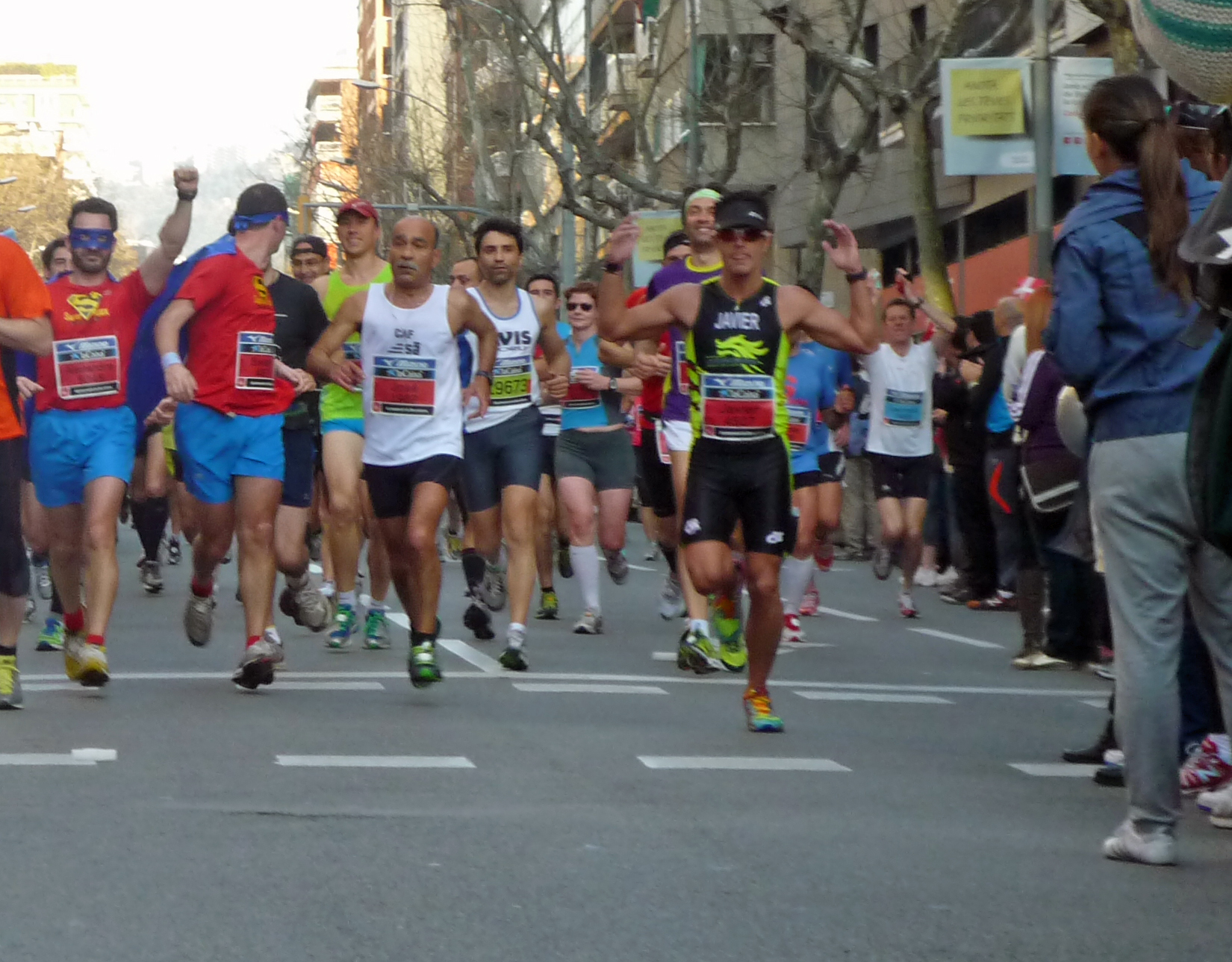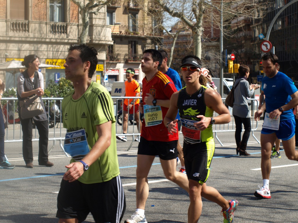 Salgo a paso lento, no hay otra opción, somos muchos. Al cruzar la línea de salida empiezo a correr y a coger ritmo. Subo por la calle Tarragona que a pesar de hacer subida se hace bien. Llego a la intersección con Berlín, ahí está Clara, la saludo y le digo que voy regular, que me duele el gemelo. Sigo adelante, el ambiente a pesar de lo temprano que es ya es espectacular, hay mucha gente animando. Corro por la Diagonal, voy a 4:40min/km, aunque con dolor. De repente oigo gritos: Heeeee, hijo… cab… Me giro y veo al mayor idiota, que he visto en mucho tiempo en una carrera. Un hombre al que le apetece cruzar con su bicicleta, y cruza, entre medio de todos los corredores, bloqueando a todo el mundo, y lo que es peor encima recriminando a los que le llaman la atención. Bajo por el Camp Nou, esto hace bajada, me dejo ir y aumento un pelín el ritmo. Bueno, parece que el dolor en el gemelo está ahí, pero de momento se puede soportar. Sigo por Travessera de les Corts y ahí veo a mi padre al otro lado de la calle ¡Papaaaaaaa! le grito e intenta seguirme con la cámara. Un poco más adelante de nuevo veo a la familia Trienjoy fotografiando a los corredores otro año más. Al bajar por Numancia y en la intersección con Berlín busco a Clara de nuevo, pero no la veo, además voy concentrado en intentar que le gente nos anime, que están muy callados, y parece que funciona. Ah no, los gritos de ánimo no son gracias a mi, me acabo de dar cuenta de que estoy corriendo al lado de dos Superman ¡qué cosas tiene la Maratón! ¡me encanta!