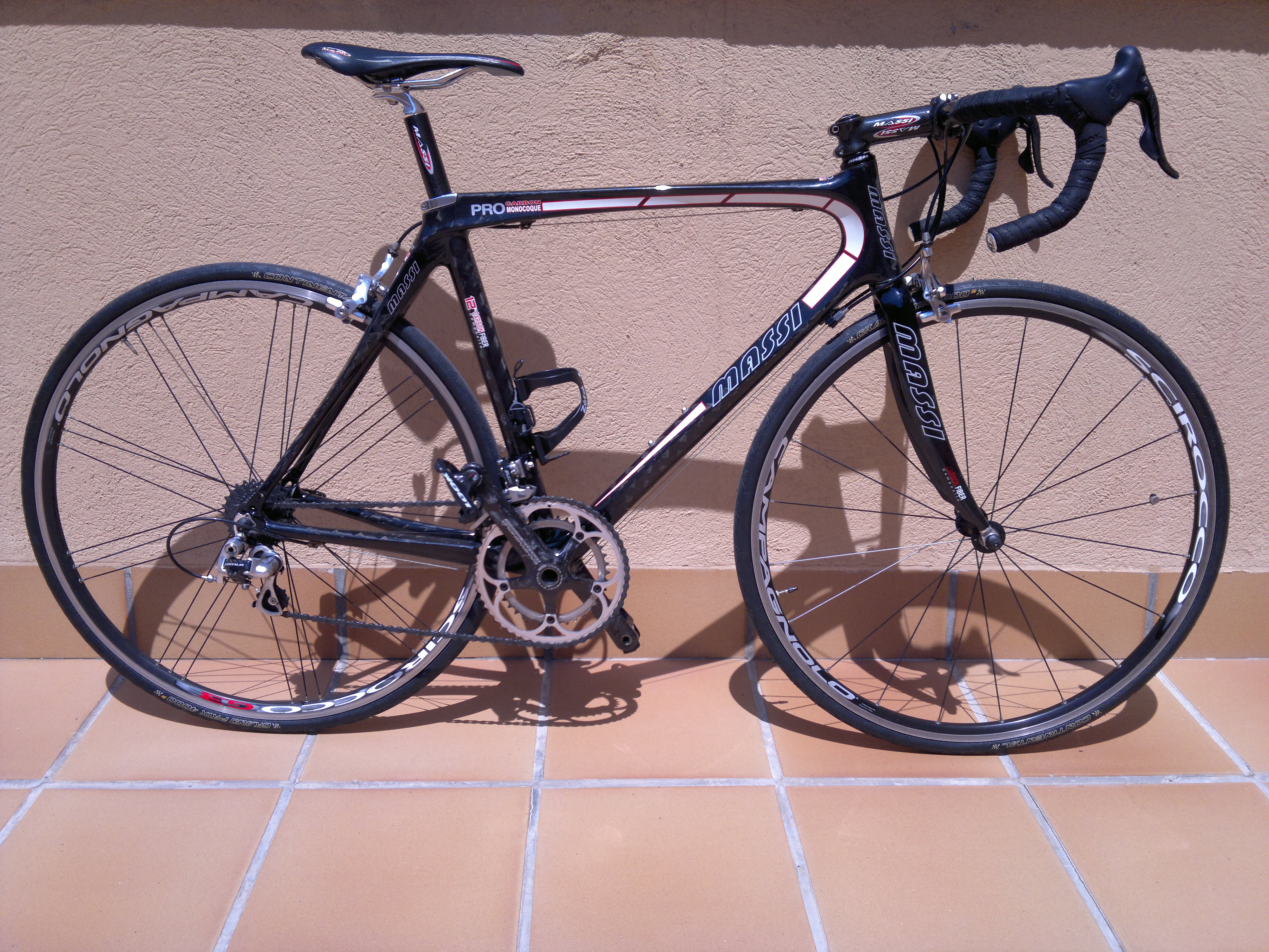 Al salir después de haber visto las Massi Team y las Pro aunque con pocas ganas de comprar en ese momento por su precio y el desconocimiento de la marca. Entonces me acordé de que un amigo tenía una y llamé para preguntarle por ella y su rendimiento. Pues bien al decirle que me quería comprar una bicicleta de carretera me ofreció el poder comprarle la suya. Una Massi Pro Carbon. Además me dijo que el estaba muy contento y que no había tenido ningún problema. Decidimos dejar la conversación y a los pocos días me mandó la oferta, la valoré y me decidí y «le voilà! una bicicleta de carretera, una bicicleta de carbono, para mí. Massi Pro Carbon con todos los componentes Campagnolo Centaur y llantas Campagnolo Scirocco, a buen precio.