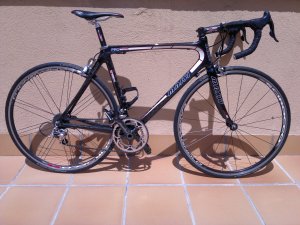 Yo de momento no puedo hablar de su rendimiento en carretera, ya que sólo he salido a probarla pocas veces para habituarme a ella. Es la primera vez que me monto en una bicicleta de carretera y es muy distinto a una mountain bike. El cuerpo va mucho más inclinado hacia adelante y cogerse al manillar y a la vez tocar las manetas del desviador, el freno y aguantar el equilibrio con unas ruedas que no hacen ni la mitad que las de BTT resulta, cuando menos, engorroso. Y si a eso le añadimos el tener que llevar las botas con las fijaciones…pues eso. Sólo puedo decir que las ultimas veces en cada semáforo, a la hora de apoyar algún pie en el suelo, me veía besando el asfalto y eso que llevo los muelles lo más aflojados posible. Además de todas estas nuevas situaciones hay que tener en cuenta que si nunca has ido «acoplado», es difícil habituarse y que la bicicleta, por lo menos a mi, me ladeaba lo suficiente como para que me salieran un par de protuberancias en el cuello. En fin, yo creo que en unos días os podré contar más cosas sobre mi nueva adquisición y su comportamiento en carretera.